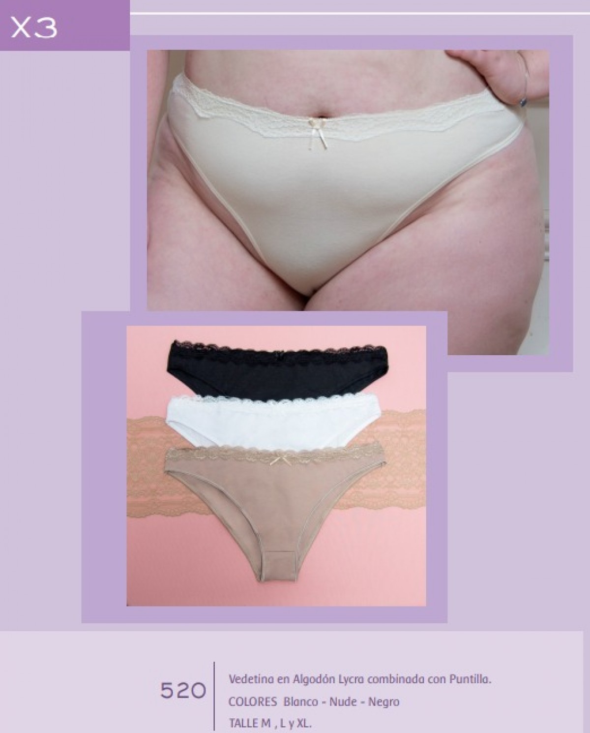 PACK X3 VEDETINA EN ALGODON Y LYCRA COMBINADA CON PUNTILLA - COLOR: (BLANCO + NEGRO + NUDE)